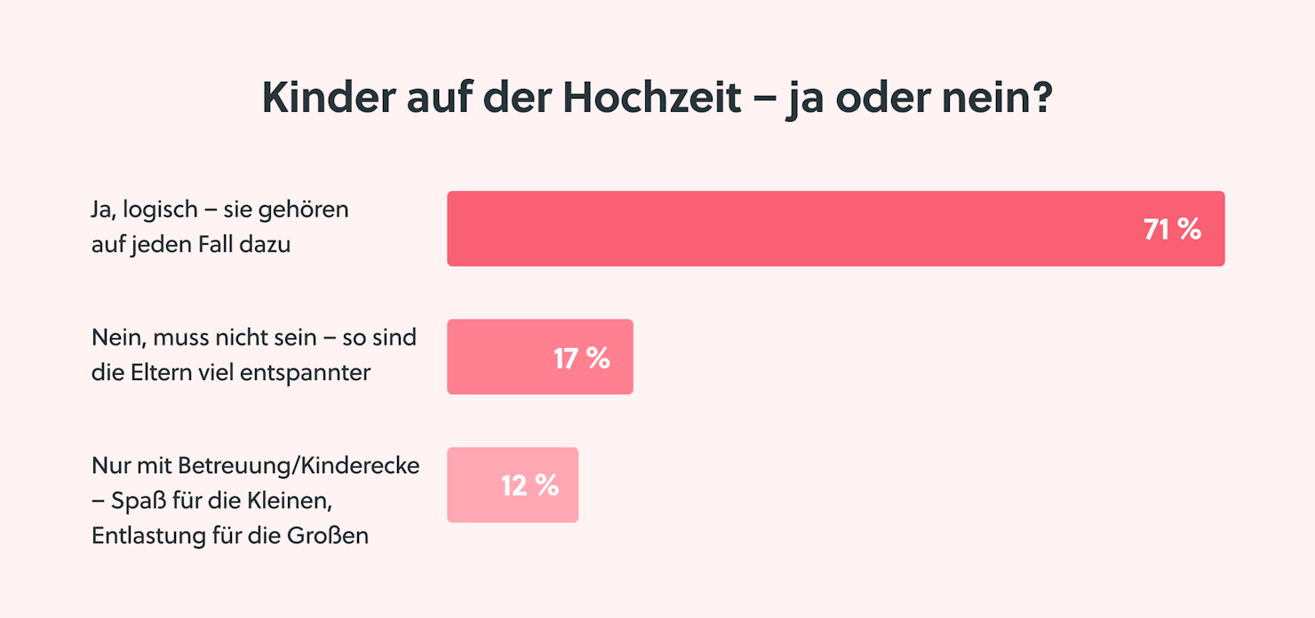 Das Ergebnis: Rund 71 % finden, dass Kinder auf jeden Fall dazugehören. Etwa 17 % bevorzugen Feiern ohne Kinder und 12 % wünschen sich eine Lösung mit Betreuung oder eigener Kinderecke.